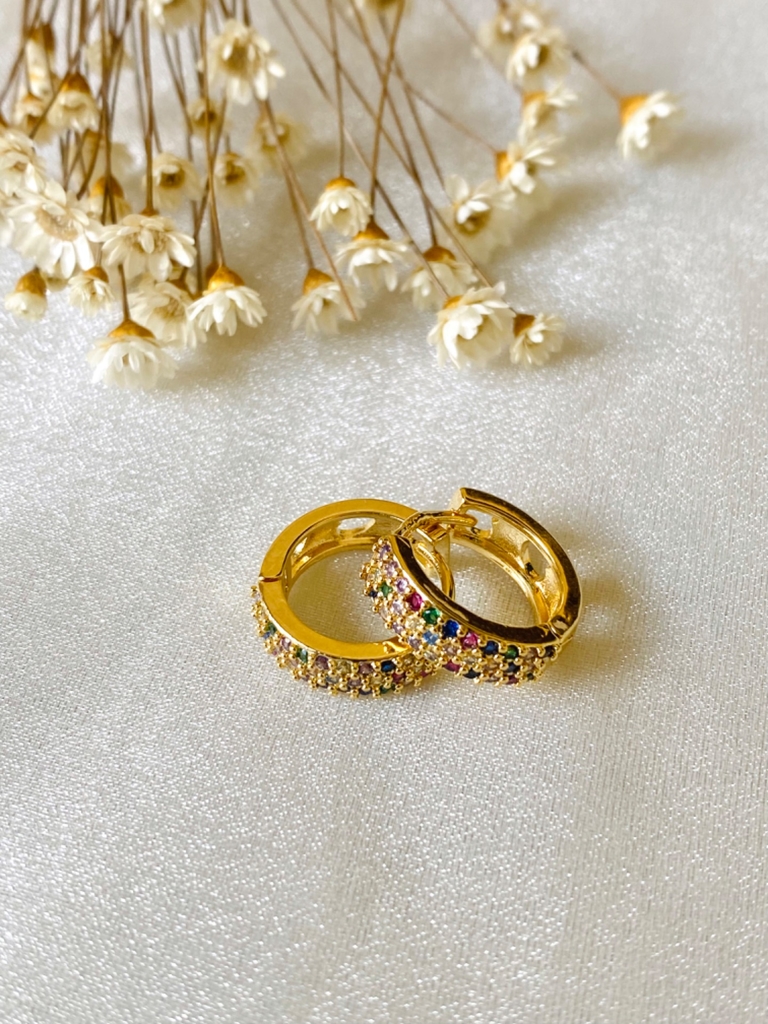 Brinco banhado a Ouro (18k). Linda argola cravejada com zircônias coloridas.
