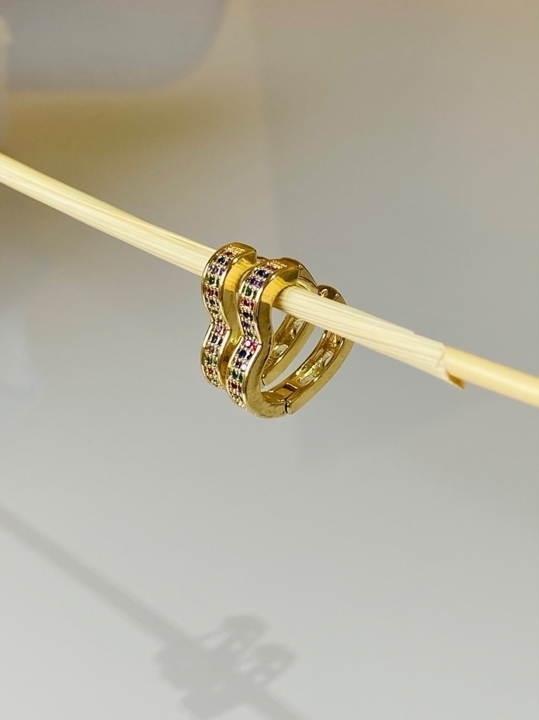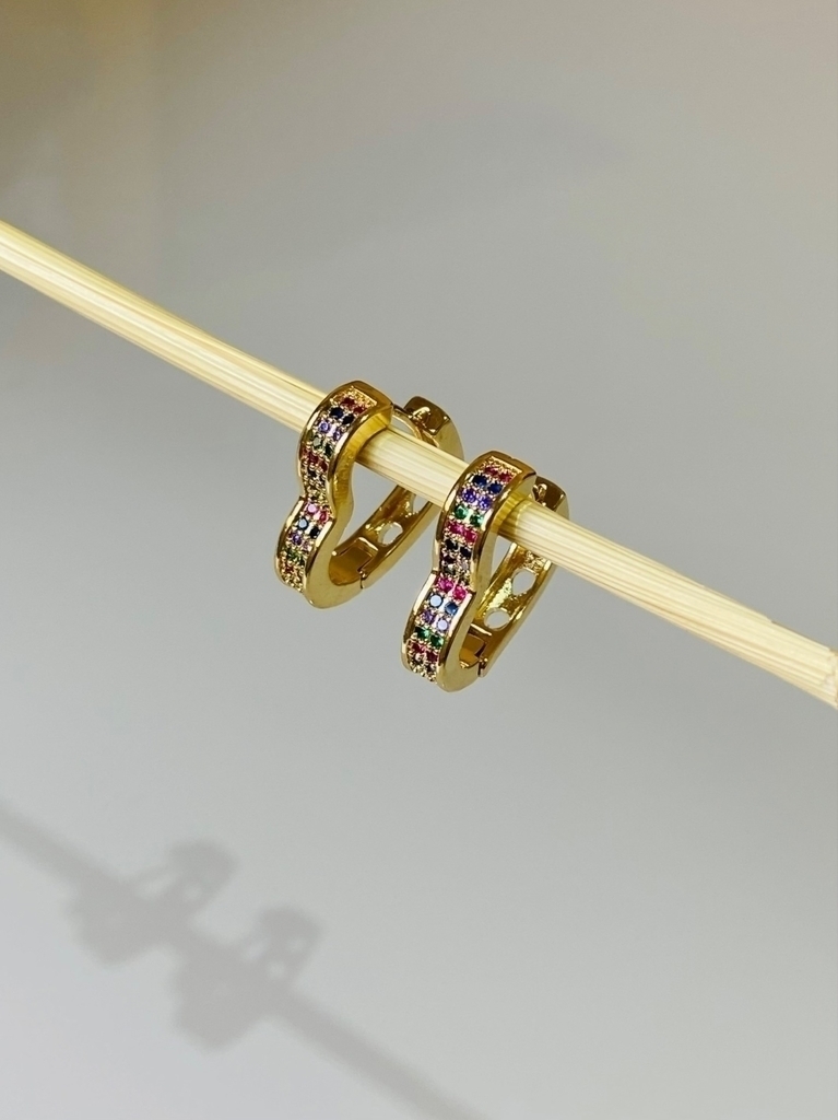 Argola dourada e banhada a ouro (folheado 18k). Essa argola tem detalhes de coração com mini zircônias coloridas. Super prática e ideal para o dia a dia. Para mulheres que gostam de brincos pequenos é uma excelente opção.