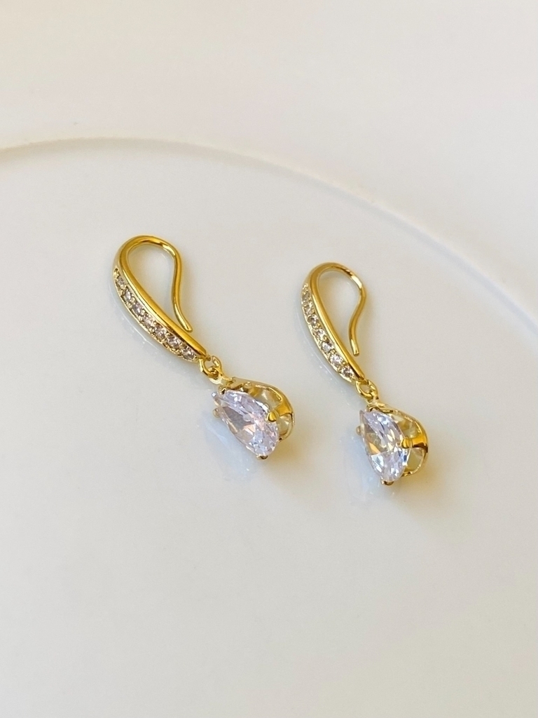 Brinco dourado e banhado a ouro (folheado 18k). Possui detalhe de mini zircônias cravejadas e uma gota dando um charme nessa peça. Não possui tarrachinha. Peça super prática e delicada!