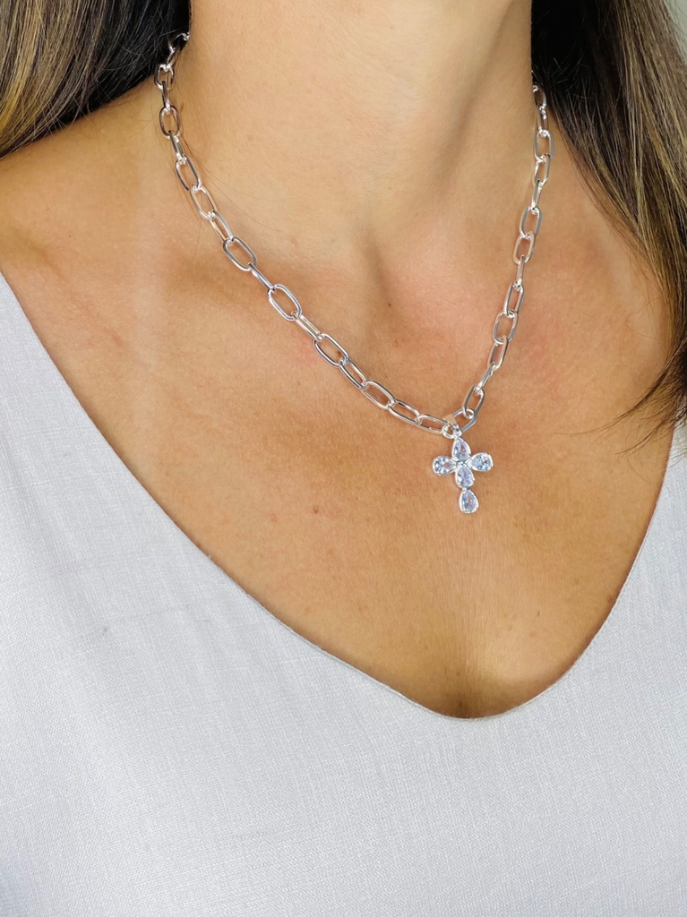 Colar banhado a Prata. Esse colar possui a corrente com elos cartier e uma cruz com zircônias transparentes. Possui garantia de 1 ano.
